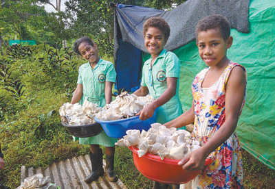 中國政府麵向斐濟等太平洋島國推廣菌草技術,推動當地經濟發展,助力當地民生改善。圖為(wei) 在斐濟奈塔希裏乳業(ye) 婦女組織菌草技術示範點,孩子們(men) 正在幫忙采菇。