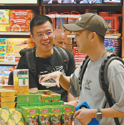在泰國曼穀素萬(wan) 那普機場免稅店,兩(liang) 名中國遊客正在購買(mai) 當地特色產(chan) 品。本報記者 白元琪攝