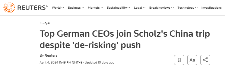 路透社分析稱,這份高管名單,凸顯了中國作為(wei) 德國最大貿易夥(huo) 伴的“重要份量”。