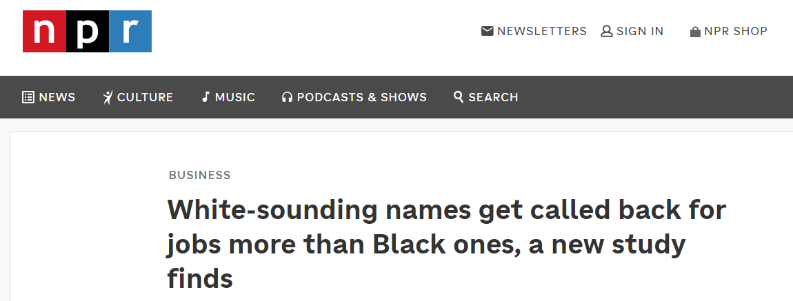 據美國全國公共廣播電台(NPR)網站報道,研究人員向約100家美國企業(ye) 的11000個(ge) 初級職位投遞了履曆相同,但個(ge) 人信息(姓名、性別等)不同的83000份“偽(wei) 造”簡曆。研究發現,名字聽起來“像白人”的求職者被招聘方回複的概率更高,比名字“像黑人”的求職者平均高9.5%。在一些情況更嚴(yan) 重的企業(ye) ,這一差距上升到約24%。