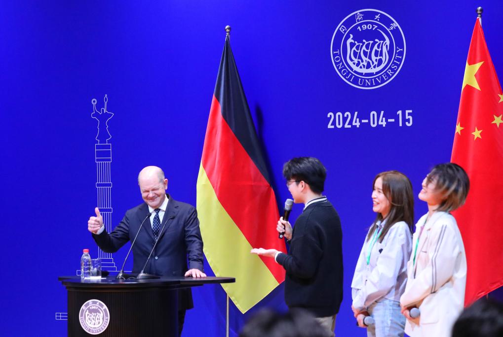 4月15日,德國總理朔爾茨(左)在同濟大學嘉定校區與(yu) 學生進行交流。新華社記者方喆 攝