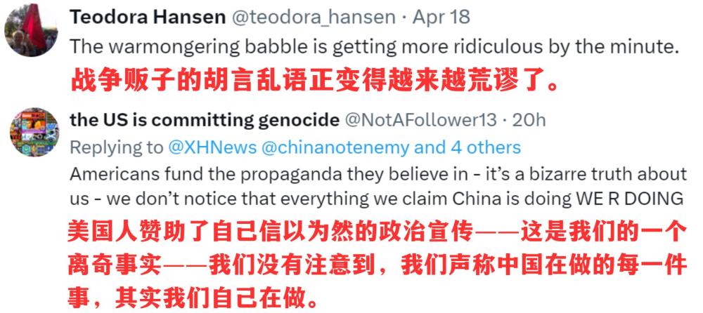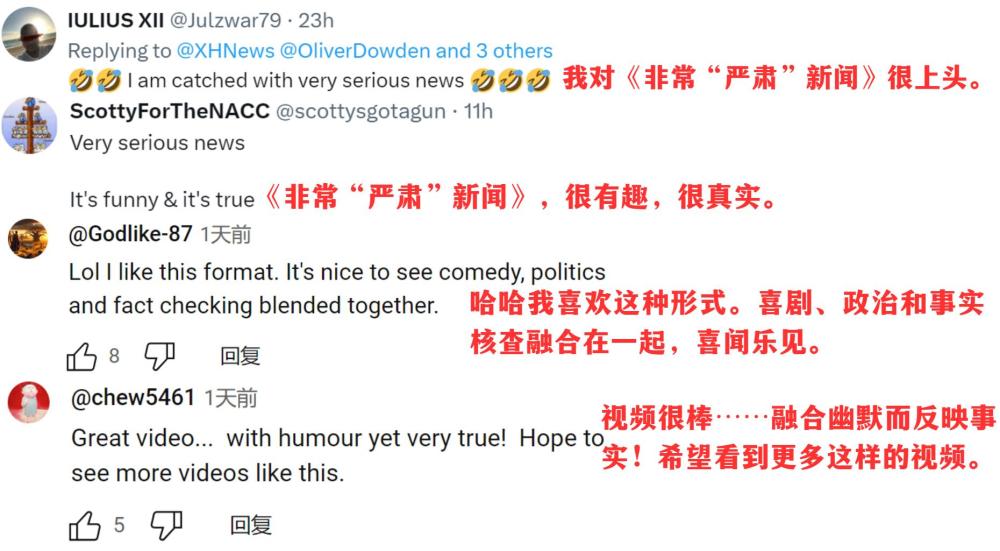 脫口秀播發後,英國議會(hui) 議員喬(qiao) 治·加洛韋、倫(lun) 敦廣播公司主持人丹尼絲(si) ·黑德利、倫(lun) 敦都市大學副教授康斯坦丁諾斯·皮塔基、美國反戰組織“粉色代碼”等機構和個(ge) 人賬號紛紛轉讚評。網友們(men) 在評論區呼籲:這樣有趣又有料的節目,多多益善!