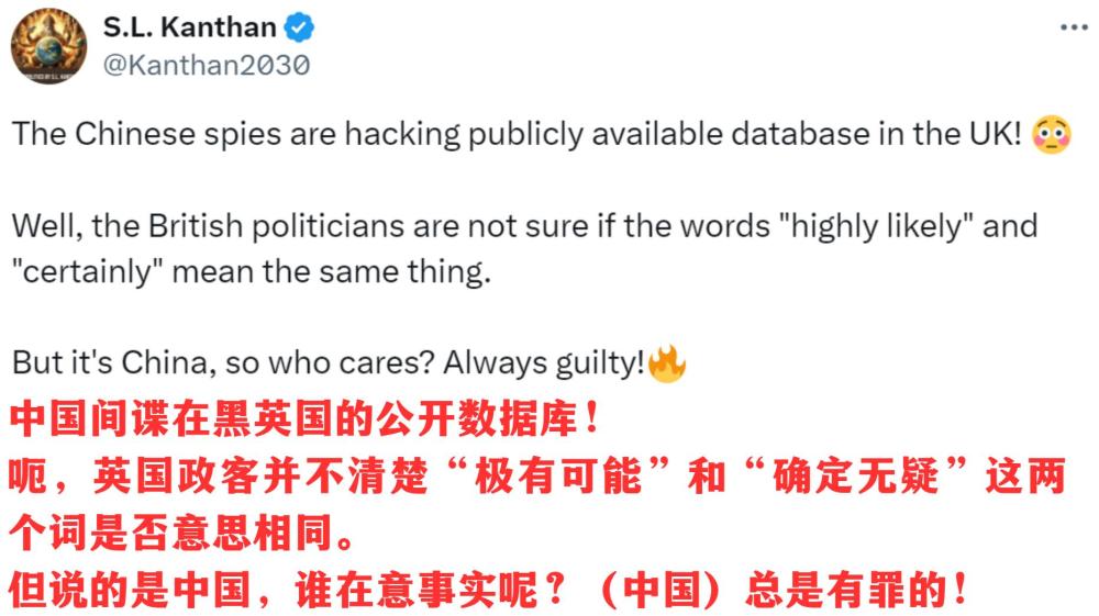 如今,“中國=網絡黑手”似乎成了某些西方政客用來解釋一切負麵事件的萬(wan) 能答案。凱特王妃被網友“黑”過頭?怪中國去。一艘由丹麥公司租用、懸掛新加坡國旗、前往斯裏蘭(lan) 卡的船撞上美國橋?還是怪中國去。