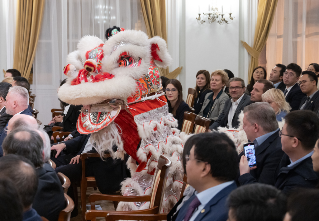2023年11月20日,匈牙利羅蘭(lan) 大學中文係成立100周年慶典在匈首都布達佩斯舉(ju) 行,中匈各界百餘(yu) 名代表參加。圖為(wei) 慶典上拍攝的舞獅表演。新華社發(弗爾季·奧蒂洛攝)
