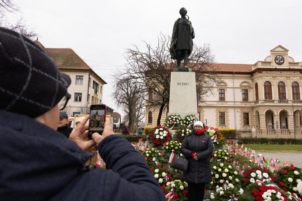 2023年3月15日,匈牙利首都布達佩斯和裴多菲出生地小克勒什舉(ju) 行慶祝活動,紀念1848年革命和自由鬥爭(zheng) 175周年。圖為(wei) 民眾(zhong) 當日在小克勒什的裴多菲雕像前拍照留念。新華社發(弗爾季·奧蒂洛攝)