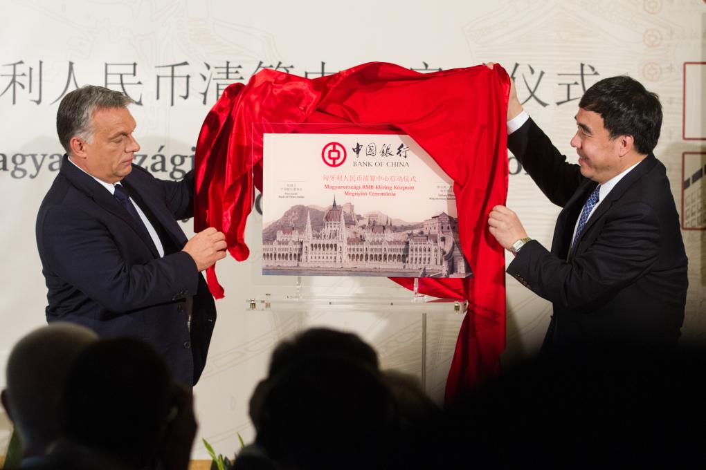 2015年10月2日,匈牙利總理歐爾班(左)在布達佩斯參加匈牙利人民幣清算行啟動儀(yi) 式。該行成為(wei) 中東(dong) 歐首家人民幣清算行。新華社發(弗爾季·奧蒂洛攝)