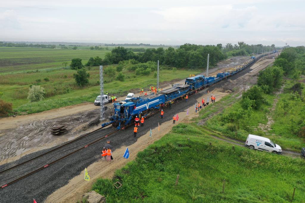 2023年5月30日,匈塞鐵路匈牙利段孔聖米克洛什-陶什站至伯斯特爾站區間首對鋼軌開始鋪設。圖為(wei) 當天孔聖米克洛什-陶什站施工現場(無人機照片)。新華社發(中國中鐵匈塞鐵路項目經理部供圖)