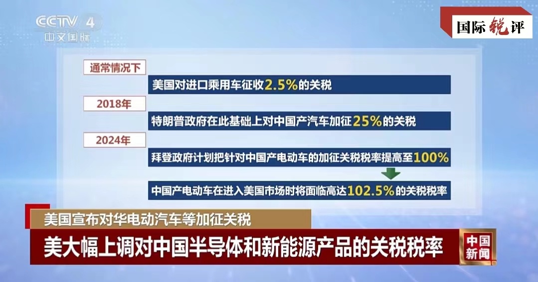 這其中,對中國電動汽車加征的進口關(guan) 稅令人瞠目——從(cong) 27.5%升至102.5%,對太陽能電池的進口稅從(cong) 25%提高到50%,對鋰電池的關(guan) 稅稅率從(cong) 7.5%提高到25%。不難看出,美國政府此次針對的重點是中國新能源相關(guan) 產(chan) 業(ye) 。難怪美國多名高官近期密集炒作所謂中國新能源“產(chan) 能過剩”,不過是為(wei) 加征關(guan) 稅製造借口。