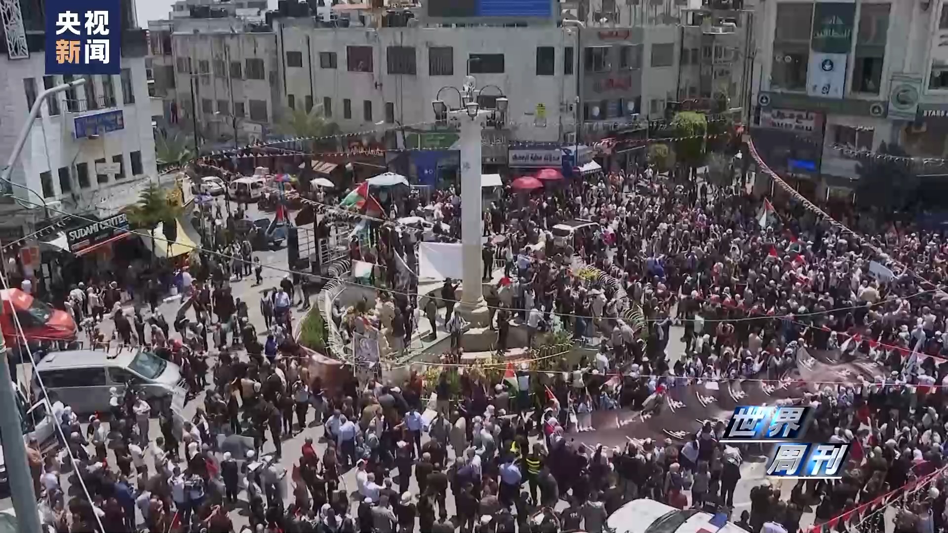 5月15日當天,約旦河西岸城市拉姆安拉,數千名民眾(zhong) 參與(yu) 遊行,他們(men) 高舉(ju) 象征巴勒斯坦人民回歸權的鑰匙和象征沾滿鮮血的援助物資的道具,高呼口號,要求結束以色列占領以及巴勒斯坦人回歸故土。