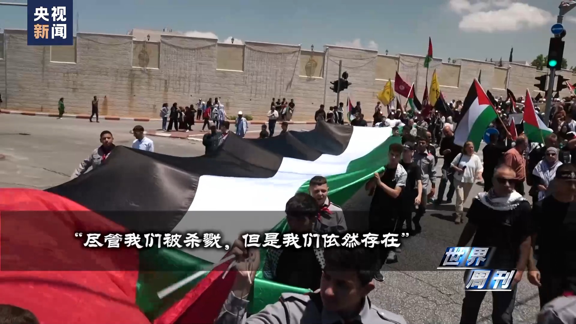 一場支援巴勒斯坦人“災難日”的抗議活動正在進行。人們(men) 高舉(ju) “反種族滅絕”“解放巴勒斯坦人”等標語。