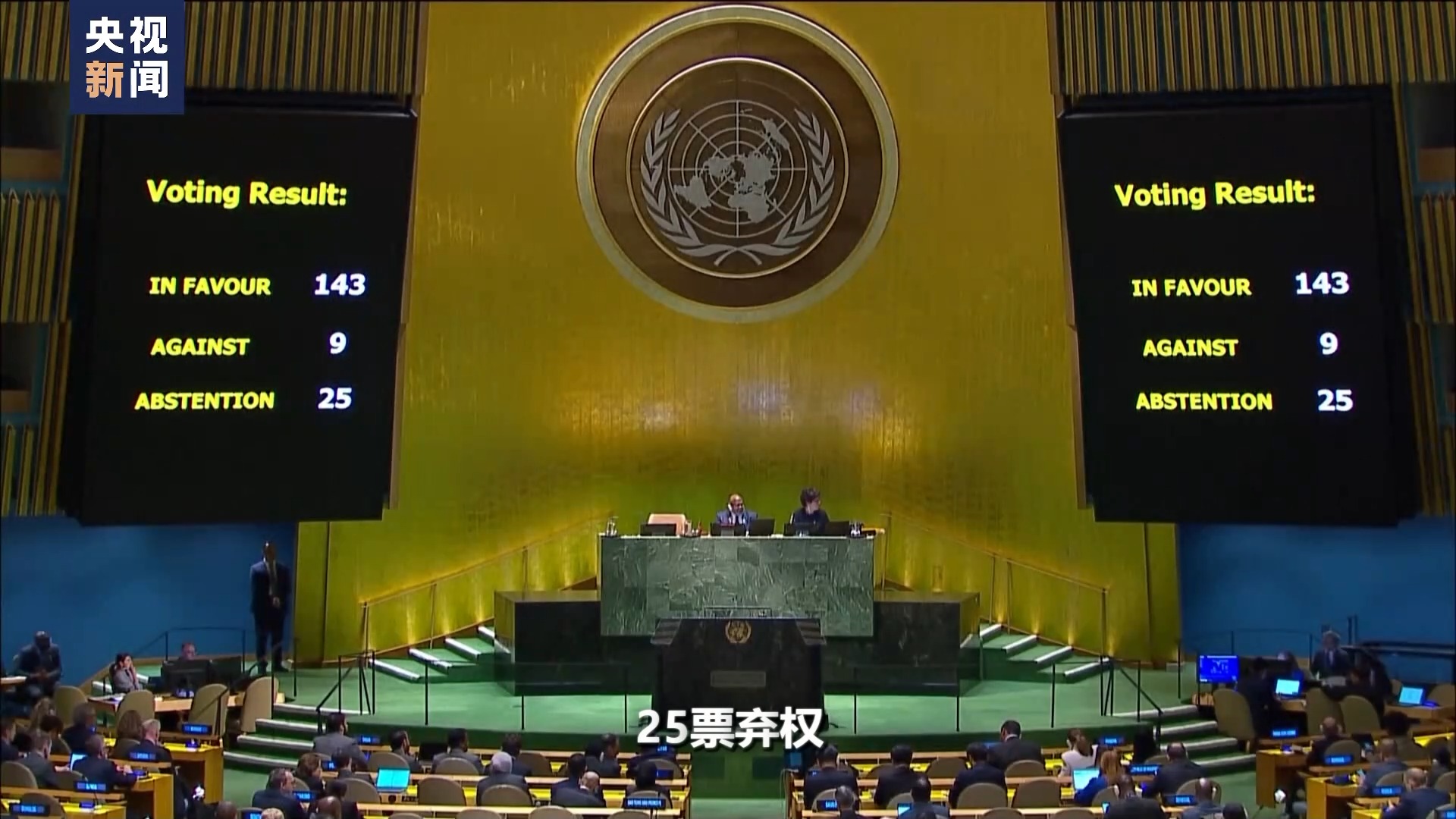 聯合國大會(hui) 主席 丹尼斯·弗朗西斯:表決(jue) 結果如下:143票讚成,9票反對,25票棄權。