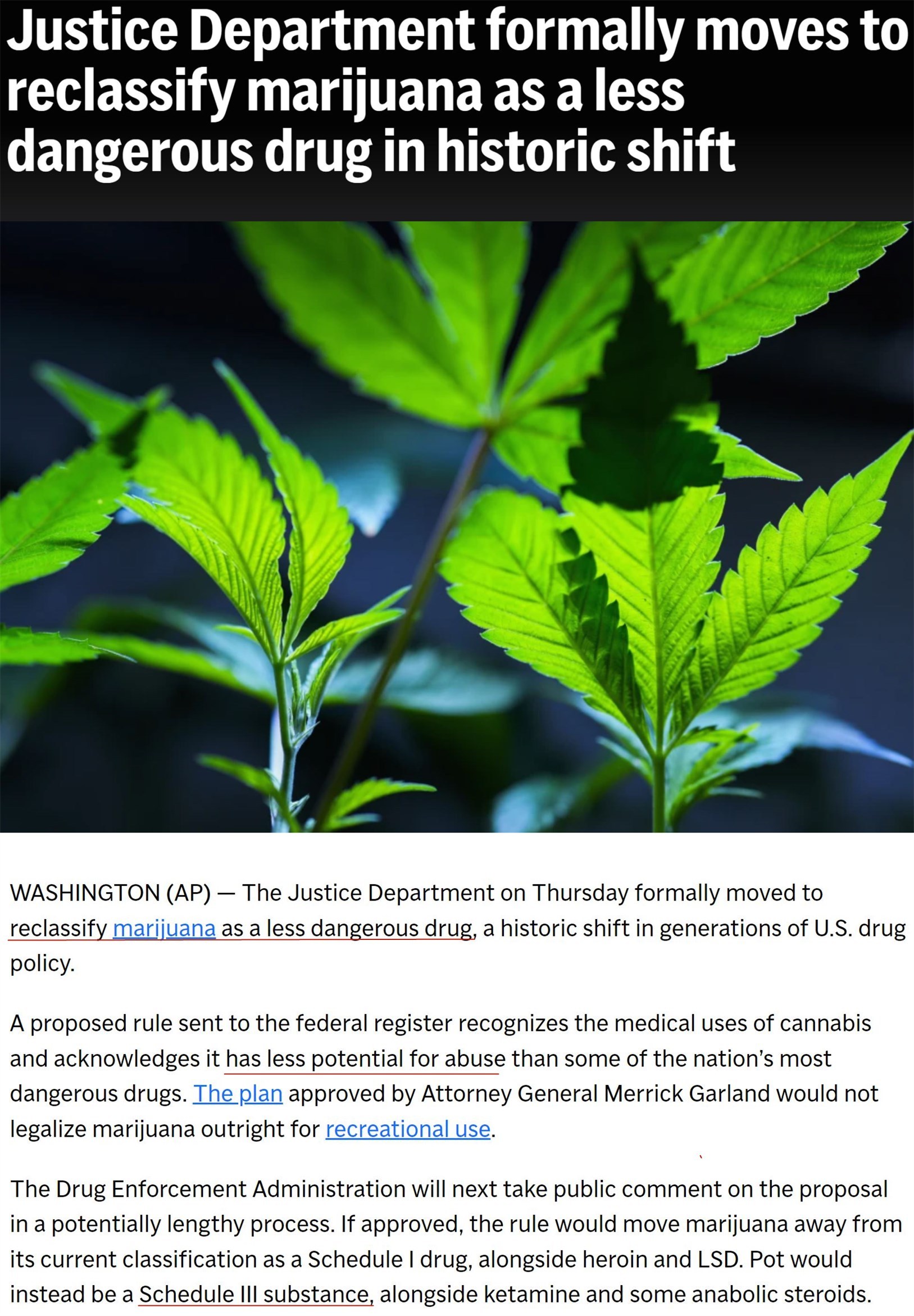 如果經過60天的公眾(zhong) 意見征詢期後最終獲批,新規則雖然不會(hui) 在聯邦層麵將大麻完全合法化,但會(hui) 將其移出《美國聯邦管製物質法案》中列管海洛因等最危險毒品的“附表一”,轉而歸入列管氯胺酮和類固醇等危險性較低藥物的“附表三”。