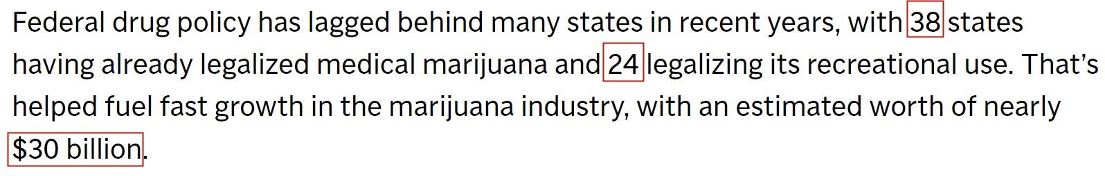 而在美國,目前已有38個(ge) 州(37個(ge) 州和華盛頓特區)將醫用大麻合法化,24個(ge) 州(23個(ge) 州和華盛頓特區)將娛樂(le) 性大麻合法化。