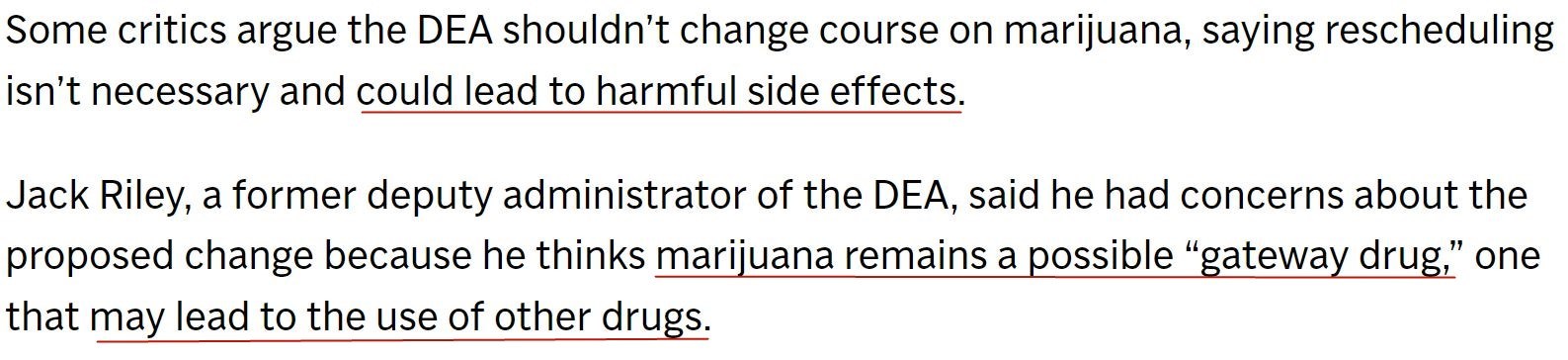 美國禁毒署前副署長傑克·萊利對擬議中的規則更改感到擔憂。他認為(wei) ,大麻仍是一種“入門毒品”,可能導致對其他毒品的使用。