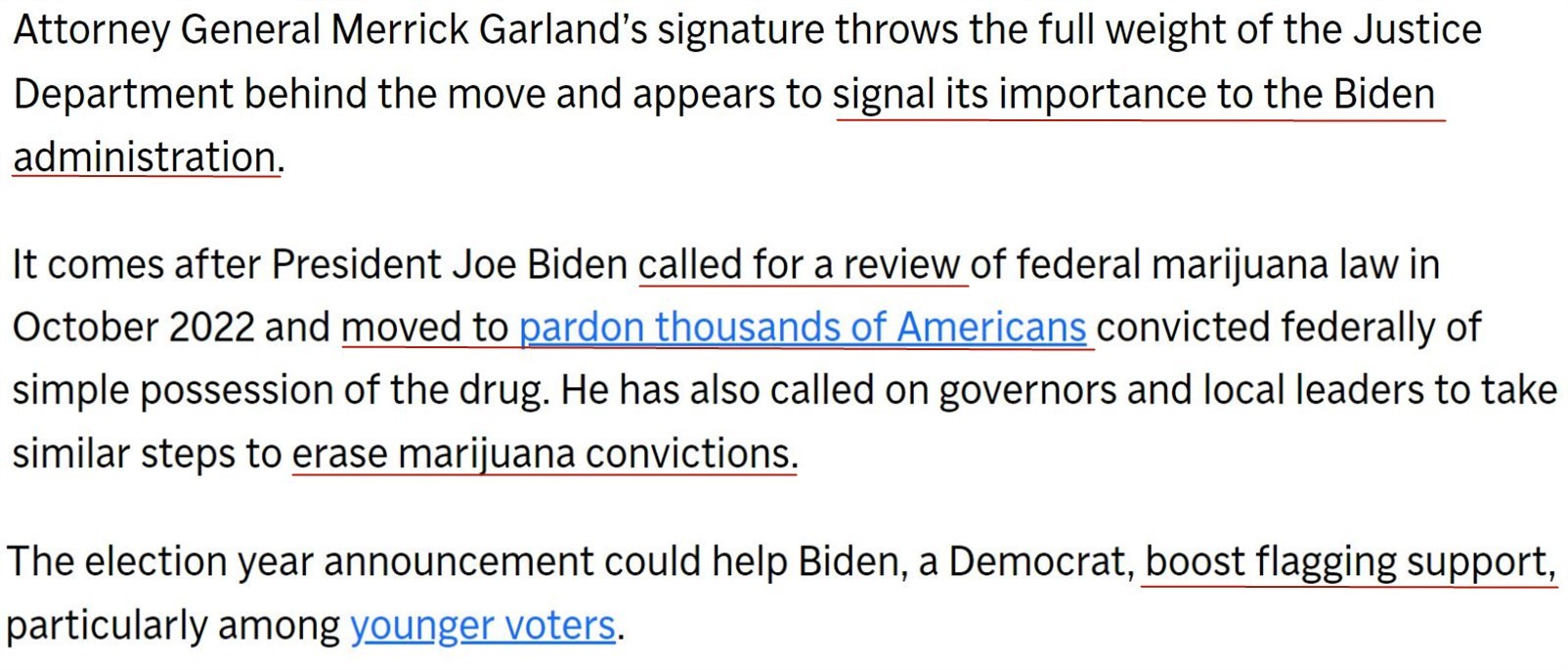 早在2022年,拜登就要求美衛生與(yu) 公眾(zhong) 服務部和司法部重新審查聯邦禁毒署對大麻的分類,並隨後赦免了數千名因持有大麻而被聯邦定罪的美國人。