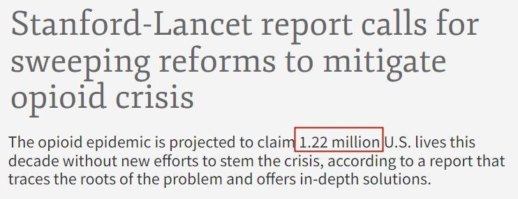根據美國斯坦福大學和英國《柳葉刀》雜誌共同進行的一項研究,如果美國不采取遏製措施,本世紀20年代將有約122萬(wan) 美國人死於(yu) 過量使用阿片類藥物,位列世界第一。