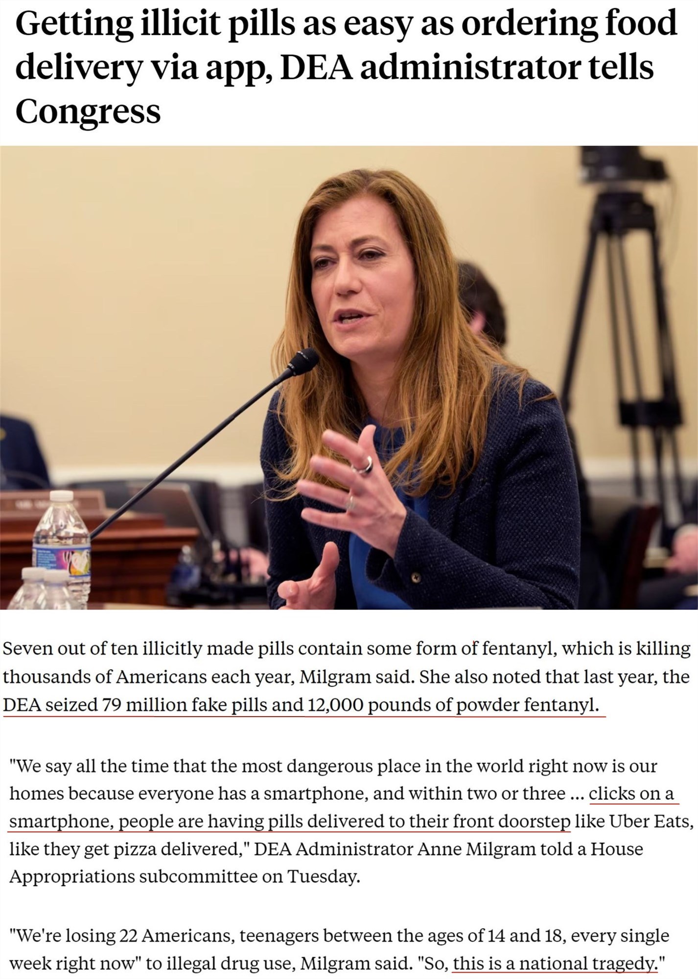美國禁毒署署長安妮·米爾格拉姆本月早些時候告訴國會(hui) :“現在世界上最危險的地方就是我們(men) 的家,因為(wei) 每個(ge) 人都有智能手機,隻要用手指點上兩(liang) 三下,就能像在外賣平台點比薩一樣,在家門口收到非法藥丸。”