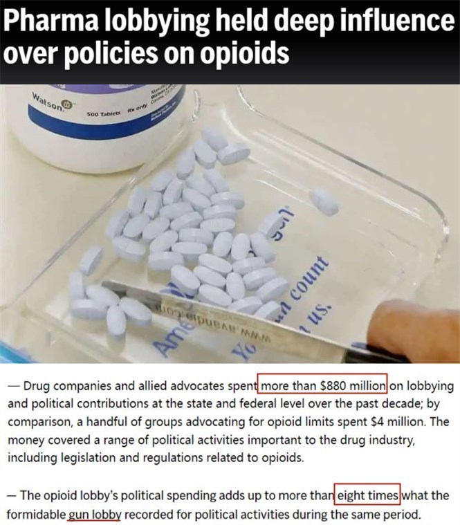據美媒披露,為(wei) 了阻止藥劑師更謹慎地開具處方、推動藥房快速售藥,阿片類藥物製造商和經銷商在近十年內(nei) 共花費了8.8億(yi) 美元用於(yu) “打通關(guan) 係”,比美國槍支遊說集團花的錢還要高8倍。