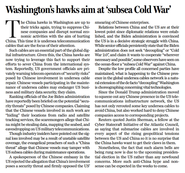 海底光纜是全球數字基礎設施的基礎組成部分。對華鷹派們(men) 正利用這一點大做文章,為(wei) 自己試圖把中國從(cong) 全球體(ti) 係中分離的行徑找理由。據報美國政府一些官員已私下向電信運營商們(men) 發出警告,稱讓中國參與(yu) 海底光纜維修可能會(hui) 引發“安全風險”,並稱參與(yu) 海底光纜維護的中國船隻可能“危及美國商業(ye) 和軍(jun) 事數據安全”。