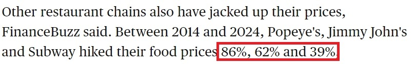 美國哥倫(lun) 比亞(ya) 廣播公司網站: 2014年至2024年間,“大力水手”“吉米·約翰”和“賽百味”的產(chan) 品價(jia) 格分別上漲了86%、62%和39%。