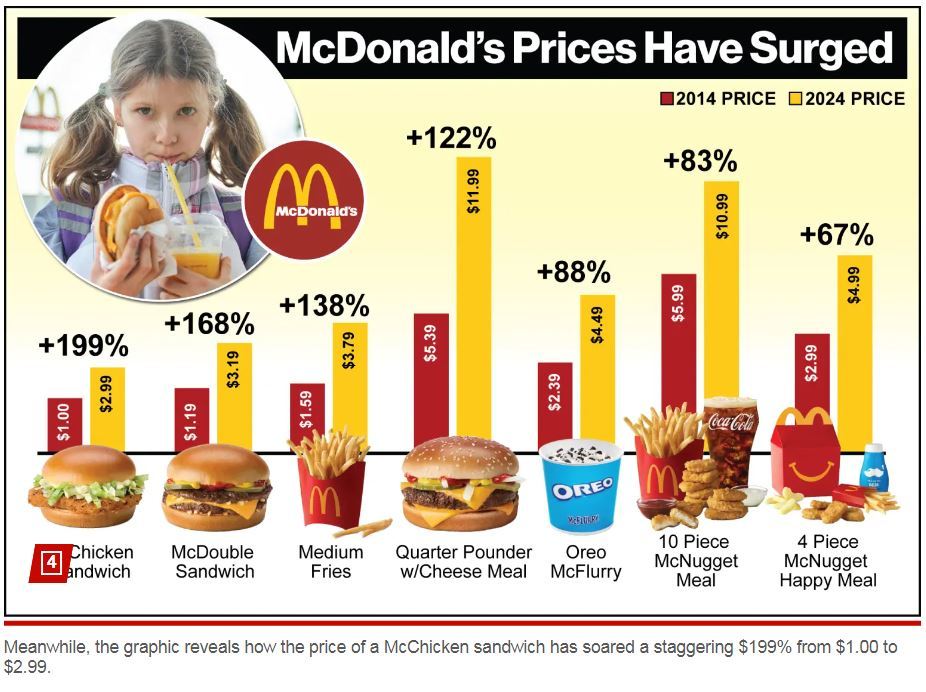 以麥當勞經典單品雙吉漢堡為(wei) 例,2014年的平均價(jia) 格為(wei) 1.19美元,現在卻賣到3.19美元,漲價(jia) 幅度高達168%。