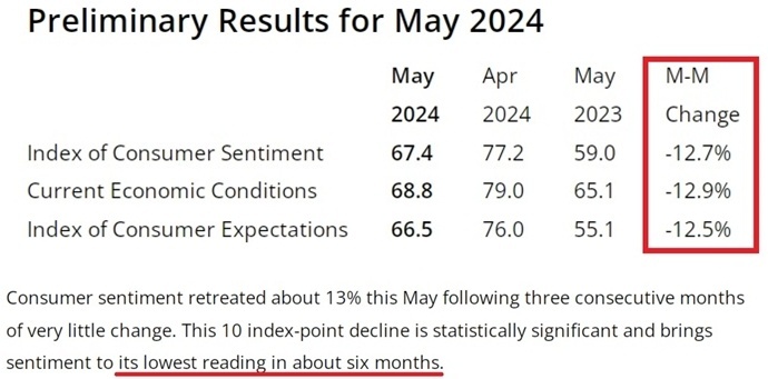 密歇根大學的最新調查顯示,由於(yu) 預期通脹率和利率都將維持在高位,美國5月消費者信心指數(CSI)在連續三個(ge) 月幾乎持平後較上月大幅回落了約13%,降至約半年來的最低水平。