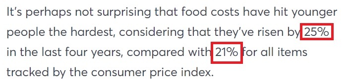 事實上,“食品通脹率”已經超過了整體(ti) 通脹率:過去四年,食品價(jia) 格上漲了25%,而所有商品的價(jia) 格平均漲幅為(wei) 21%。