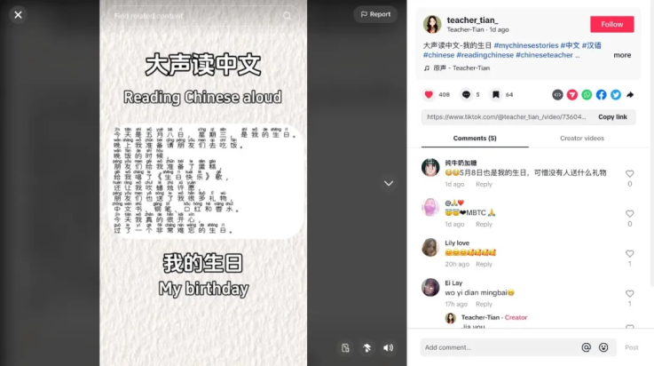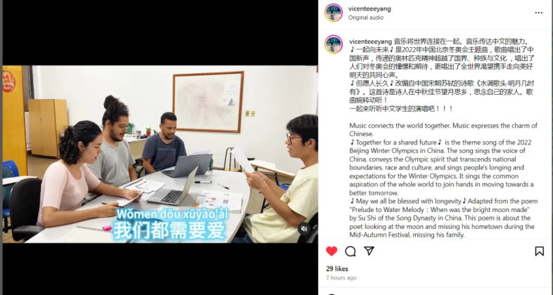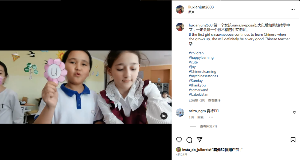 來自老撾的楊世群、菲律賓的黃玉潔、布隆迪的田曉慧和墨西哥的楊衍輝等老師,還分享了各種學習(xi) 中文的有趣方法,例如情景演繹、唱歌學中文、跟讀練習(xi) ,獲得了網友們(men) 的一致好評。