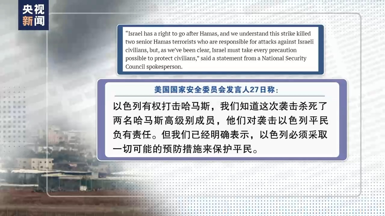 美國國家安全委員會(hui) 發言人27日稱:以色列有權打擊哈馬斯,我們(men) 知道這次襲擊殺死了兩(liang) 名哈馬斯高級別成員,他們(men) 對襲擊以色列平民負有責任。但我們(men) 已經明確表示,以色列必須采取一切可能的預防措施來保護平民。