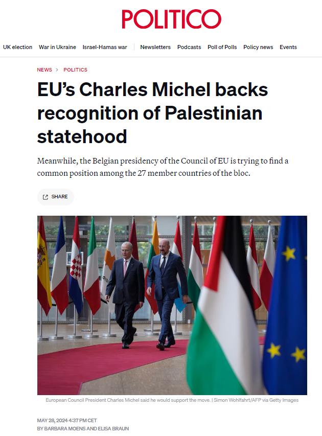 另據《政客網》歐洲版報道,目前歐洲理事會(hui) 正在尋求在27個(ge) 歐盟成員國之間就承認巴勒斯坦國問題找到一個(ge) 共同立場。