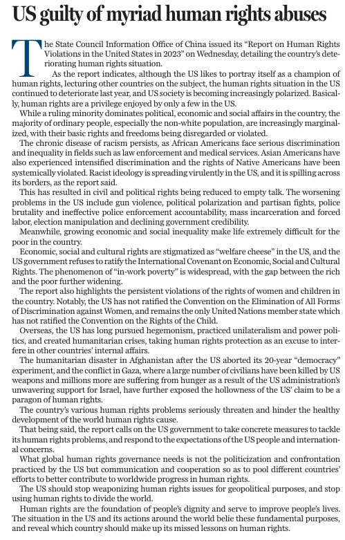 國務院新聞辦公室5月29日發表《2023年美國侵犯人權報告》,以活生生的事實和客觀數據揭露美國侵犯人權的斑斑劣跡。
