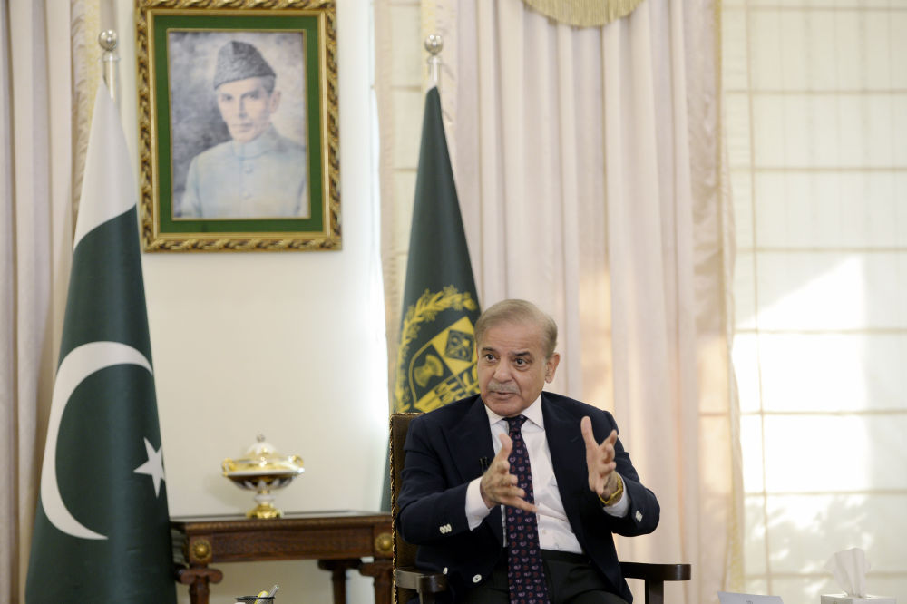 5月30日,巴基斯坦總理夏巴茲(zi) ·謝裏夫在首都伊斯蘭(lan) 堡的總理府接受中國媒體(ti) 聯合采訪。新華社發(艾哈邁德·卡邁勒攝)