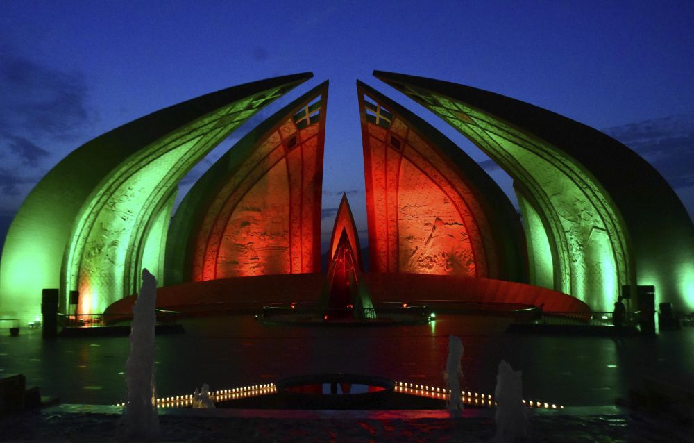 2023年7月29日,巴基斯坦首都伊斯蘭(lan) 堡的巴基斯坦紀念碑亮起中巴兩(liang) 國國旗顏色的燈光,慶祝中巴經濟走廊啟動十周年。新華社發