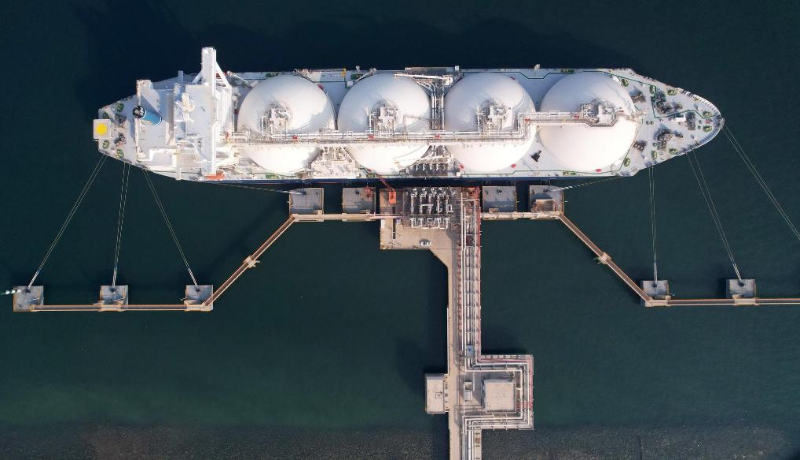 2022年10月21日,一艘液化天然氣運輸船靠泊在中國石化天津LNG接收站“1號泊位”進行卸船作業(ye) (無人機照片)。新華社記者趙子碩攝