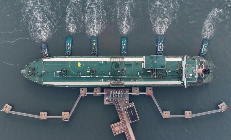 2023年11月15日,來自卡塔爾的“阿爾達夫那”號LNG輪在拖輪的協助下向唐山港曹妃甸港區中國石油唐山LNG接收站碼頭靠泊(無人機照片)。新華社記者楊世堯攝