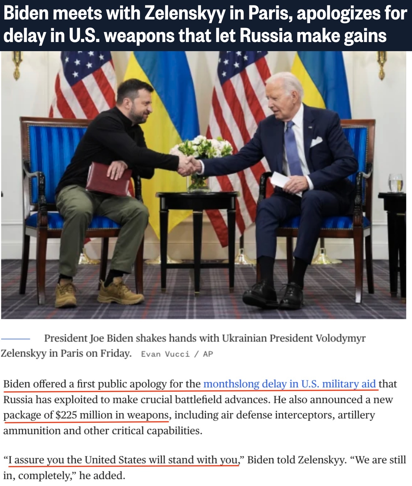在巴黎會(hui) 見烏(wu) 克蘭(lan) 總統澤連斯基時,拜登首次就美國國會(hui) 未能更早通過對烏(wu) 新援助法案“道歉”,並宣布將再向烏(wu) 克蘭(lan) 提供2.25億(yi) 美元援助。