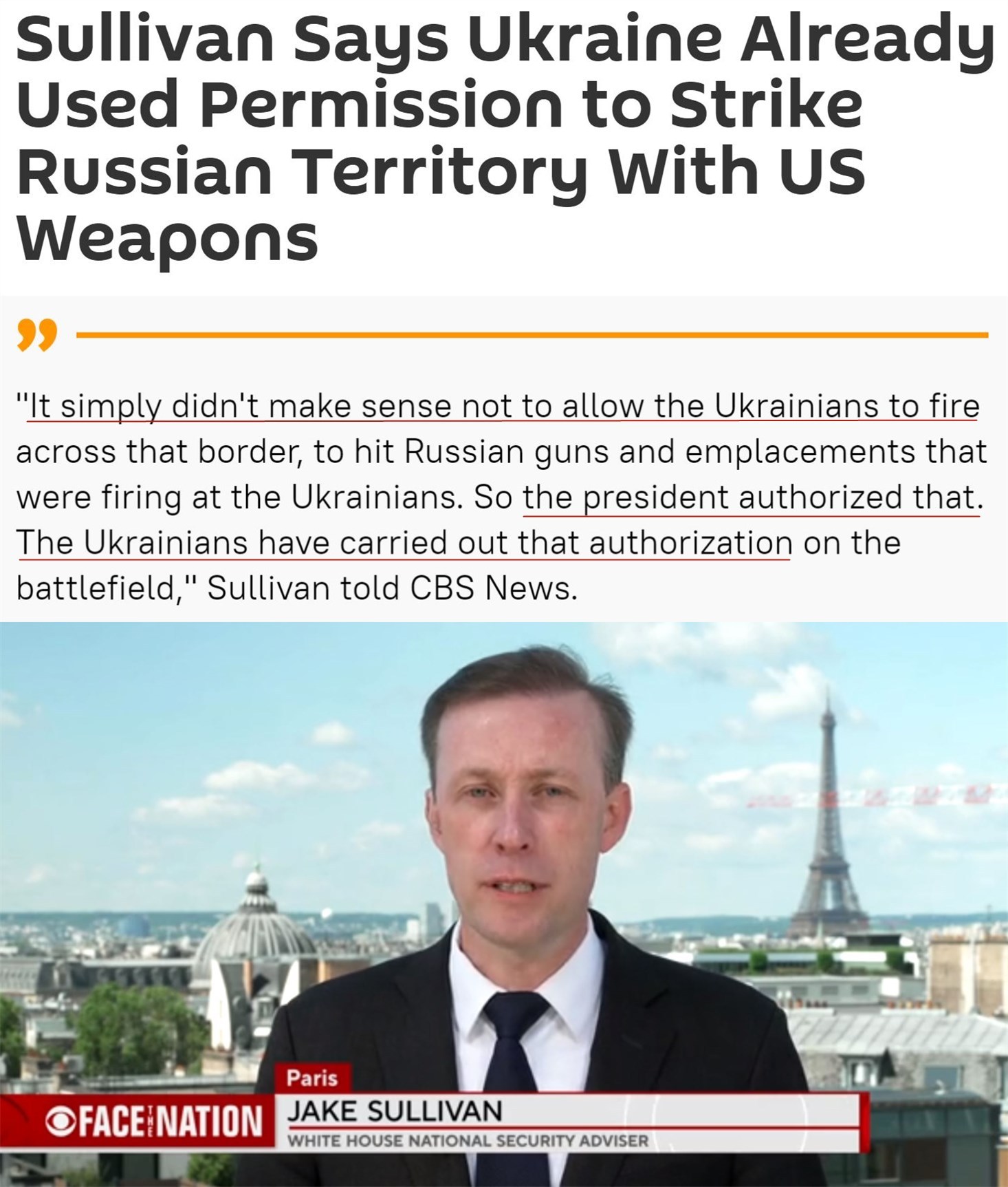 △俄羅斯衛星通訊社:美國總統國家安全事務助理沙利文9日在接受美媒采訪時證實,烏(wu) 軍(jun) 已經使用美國提供的武器打擊俄羅斯本土目標。