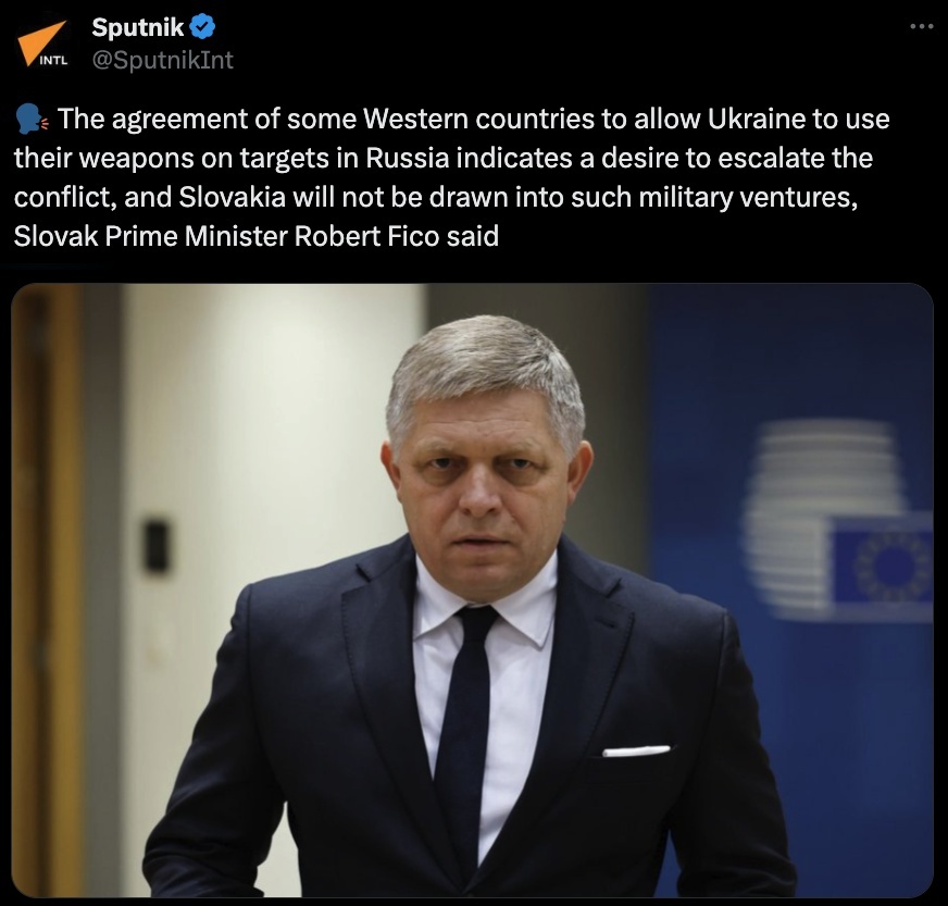 斯洛伐克總理菲佐日前也表示,西方國家允許烏(wu) 克蘭(lan) 使用西方武器襲擊俄羅斯本土目標,隻能證明它們(men) 想要的不是和平,而是它們(men) 與(yu) 俄羅斯緊張關(guan) 係的升級,斯洛伐克不會(hui) 被拉入這樣的軍(jun) 事冒險。