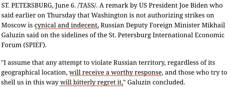 對此,俄羅斯副外長加盧津回應稱,拜登關(guan) 於(yu) 可以襲擊俄邊境地區、但不能襲擊莫斯科和克裏姆林宮的表態是“卑鄙且失禮”的。