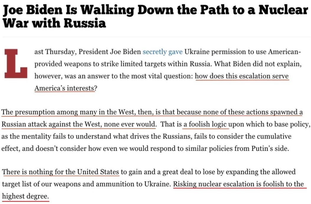 文章認為(wei) ,允許烏(wu) 克蘭(lan) 擴大美援武器的打擊範圍對美國有百害而無一利。在美國安全並未受到威脅的情況下,冒險與(yu) 俄羅斯爆發核戰爭(zheng) 簡直“蠢透了”。