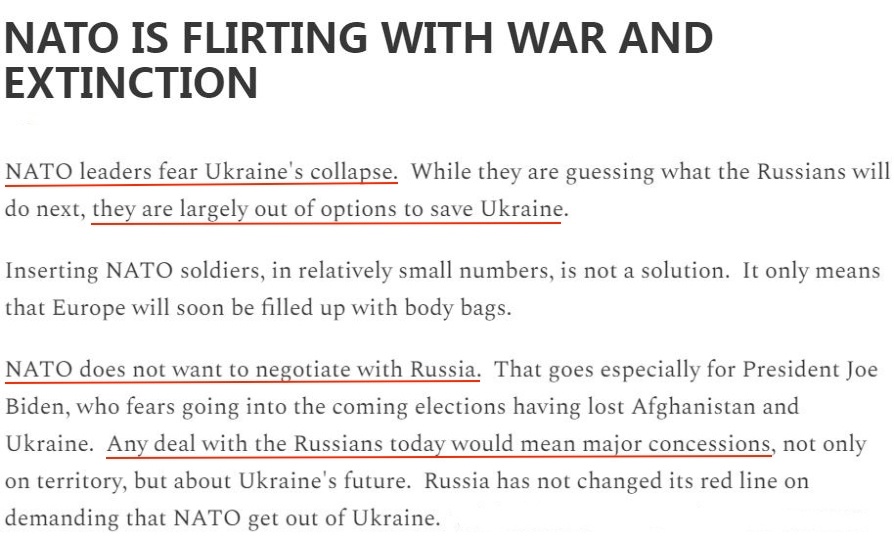 美國記者、前國防部官員斯蒂芬·布萊恩日前發表題為(wei) 《北約正把戰爭(zheng) 和滅亡當兒(er) 戲》的文章指出,雖然北約的領導人們(men) 擔心烏(wu) 克蘭(lan) 崩潰,而且他們(men) 在很大程度上救不了烏(wu) 克蘭(lan) ,但卻不想與(yu) 俄羅斯談判。美國總統拜登尤其如此。