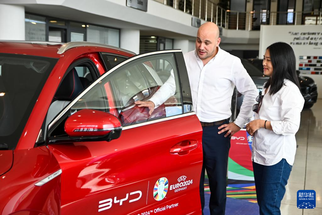 2024年5月29日,在馬耳他比爾基卡拉,馬耳他哈桑-紮米特汽車公司首席執行官德古阿拉(左)介紹一輛比亞(ya) 迪純電動汽車。新華社發(喬(qiao) 納森·博格 攝)