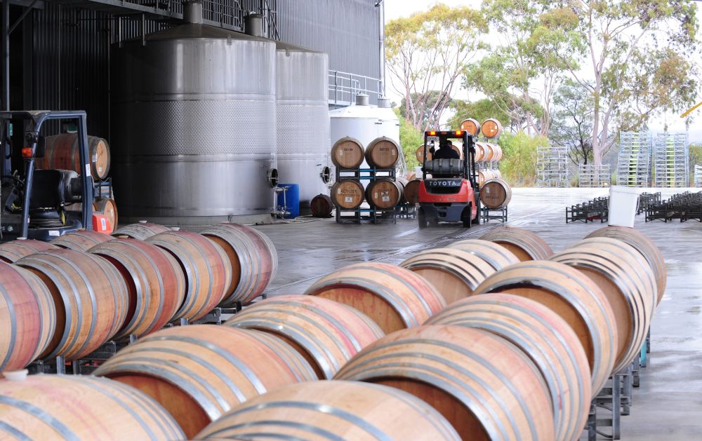 ↑5月30日,在澳大利亞(ya) 巴羅薩穀,特思納酒莊員工在倉(cang) 庫搬運葡萄酒桶。