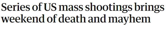文章指出,周末發生的一係列大規模槍擊事件讓美國社會(hui) 被死亡和混亂(luan) 的陰影籠罩。在大規模槍擊案發生頻率如此之高的背景下,美國民眾(zhong) 呼籲加強槍支管控的聲音日益強烈,但聯邦政府通常對此無動於(yu) 衷或無能為(wei) 力。