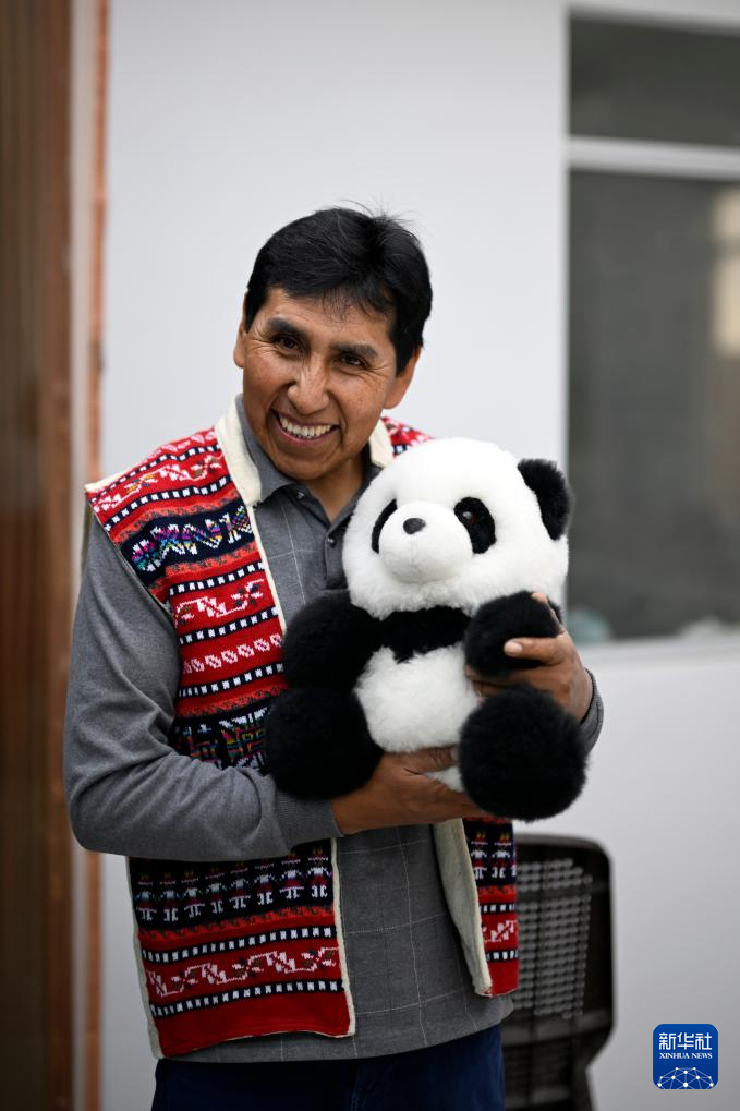 6月20日,在秘魯阿雷基帕,手工藝人奧斯瓦爾多·馬馬尼展示羊駝毛製作的熊貓玩偶。新華社記者 李木子 攝