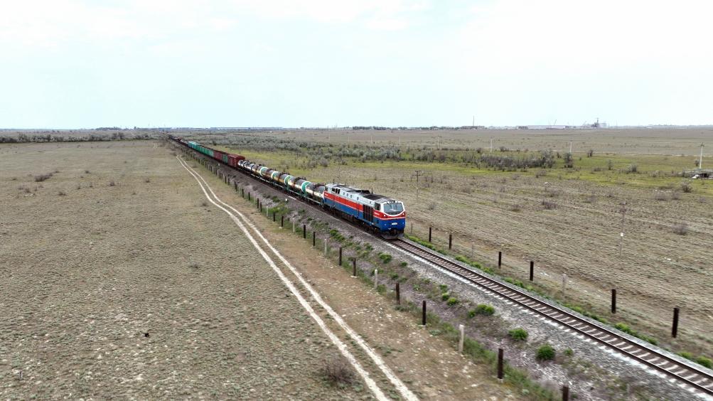 2023年5月12日,在哈薩克斯坦阿拉木圖附近,貨運列車馳騁於(yu) 阿拉木圖與(yu) 中國霍爾果斯間(無人機照片)。新華社發(奧斯帕諾夫攝)