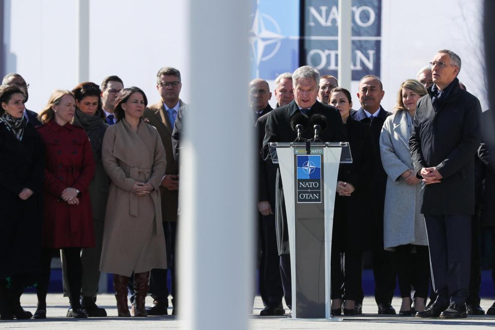 2023年4月4日,在比利時布魯塞爾的北約總部,芬蘭(lan) 總統尼尼斯托在芬蘭(lan) 加入北約儀(yi) 式上發言。新華社記者鄭煥鬆攝
