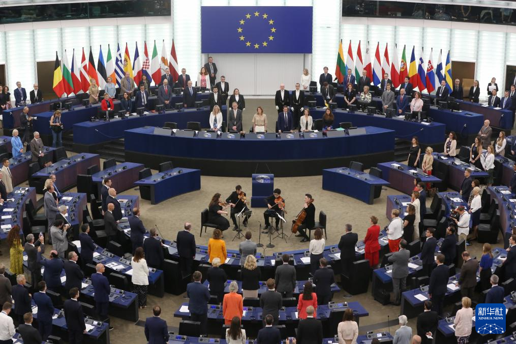 這是7月16日在法國斯特拉斯堡拍攝的新一屆歐洲議會(hui) 第一次全體(ti) 會(hui) 議現場。歐洲議會(hui) 16日在法國斯特拉斯堡召開全會(hui) ,馬耳他籍的蘿伯塔·梅措拉經投票再次當選歐洲議會(hui) 議長。新華社記者 趙丁喆 攝