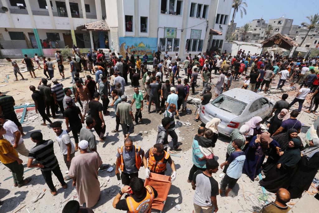 7月27日,巴勒斯坦加沙地帶衛生部門發表聲明說,以色列軍(jun) 隊當天轟炸加沙地帶中部代爾拜拉赫一家野戰醫院,造成至少30人死亡、超過100人受傷(shang) 。圖為(wei) 人們(men) 聚集在以軍(jun) 襲擊現場附近。新華社發(裏澤克·阿卜杜勒賈瓦德攝)