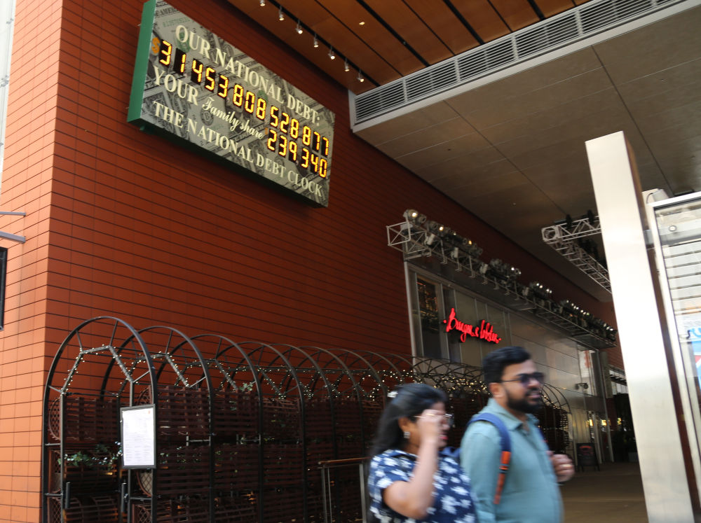 2023年5月29日,人們(men) 經過美國紐約曼哈頓的“國債(zhai) 鍾”。“國債(zhai) 鍾”是一個(ge) 大型計數器,它實時更新美國的公共債(zhai) 務總額,並顯示出每個(ge) 美國家庭所要負擔的數額。新華社記者劉亞(ya) 南攝
